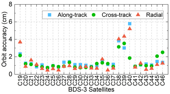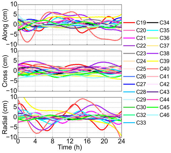 The satellite orbits are fixed when estimating the satellite clock offsets using different signal combinations. Therefore, we first analyze the satellite orbital consistency when using the two signal combinations. The BDS-3 satellite orbital difference in the three directions between the two signal combinations on DOY 172 is presented in Figure 11. The satellite orbit difference is between −5 and 5 cm for most BDS-3 MEO satellites, while larger fluctuations can be found for BDS-3 IGSO satellites (C38, C39, C40), showing worse performance due to their poorer geometries. Figure 12 presents the orbital accuracy for each BDS-3 satellite from DOY 169 to 175. The satellite orbital consistency is better than 2 cm for most MEO satellites in all three directions.