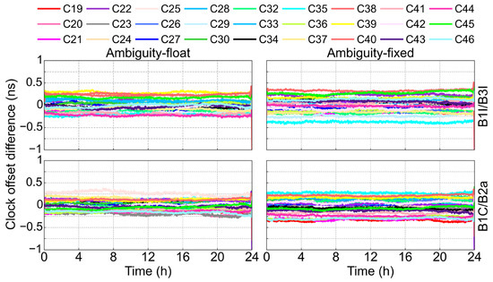 The estimated clock offset accuracy is evaluated using the typical double-difference method [2]. The satellite clock offset products from Chang’an University are used as references. The ambiguity-float and -fixed satellite clock offset errors estimated from the two signal combinations on DOY 172 are shown in Figure 13. The clock errors fall within the range of −0.5 to 0.5 ns for both ambiguity-float and -fixed solutions using two signal combinations. After fixing ambiguities, the clock offset difference is better compared to the ambiguity-float case. The mean ambiguity-fixed clock precision (STD) on DOY 172 is 0.027 ns for B1I/B3I signals and 0.024 ns for B1C/B2a signals. Since the BDS satellite orbits were estimated on a daily basis, the day boundary discontinuities of satellite orbits exist between adjacent days [37]. Therefore, when using the satellite orbits from two adjacent days for interpolation, these discontinuities will result in some outliers at the end of the day.