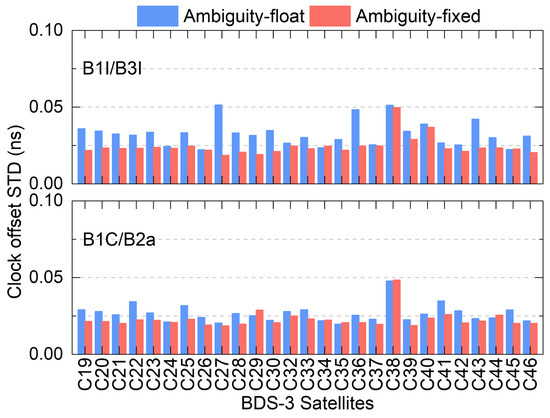 Figure 14 presents the mean clock precision for each satellite of the two signal combinations. For the ambiguity-float solutions using B1I/B3I signals, the STD of the clock errors ranges from 0.022 to 0.052 ns, in which for satellites C27 and C38, the STDs are beyond 0.05 ns. For B1C/B2a signals, the STDs are better than 0.05 ns for all satellites, ranging from 0.020 to 0.048 ns. After fixing the ambiguities, the clock precision is improved for most satellites, whereas the largest improvements amount to 63.8% for C27 using B1I/B3I signals, and 34.5% for C22 using B1C/B2a signals. Moreover, except for C38, the precision difference among different satellites is small. The mean clock precision of the ambiguity-float is 0.033 ns using B1I/B3I signals and 0.024 ns using B1C/B2a signals. After fixing the ambiguities, they are improved to 0.026 and 0.023 ns using B1I/B3I and B1C/B2a signals, with corresponding improvements of 27.3% and 7.7%, respectively. Compared to clock offset estimation with B1I/B3I signals, the improvement when using B1C/B2a amounts to 21.2% for the ambiguity-float solutions, and 4.2% for ambiguity-fixed solutions. The improvements in satellite clock precision demonstrate better performance when using the B1C/B2a signals.