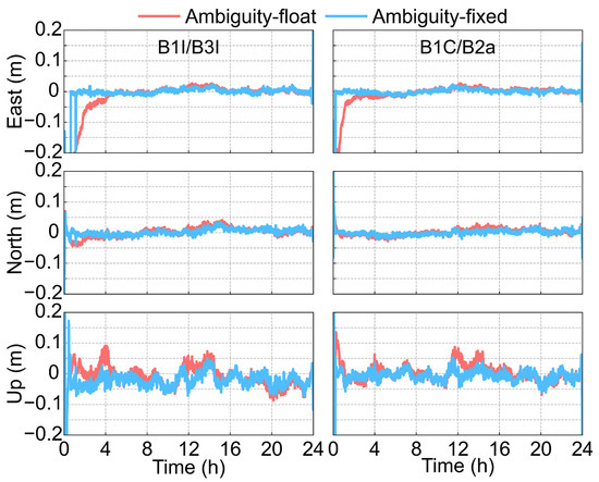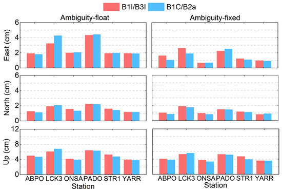 Figure 16 shows the mean positioning accuracy of each station. It can be observed that the positioning accuracy when using PPP-AR is remarkably better than the ambiguity-float solutions, especially in the E direction [28]. Table 2 presents the mean positioning accuracy for different cases. The positioning accuracy is better than 3 cm, 2 cm, and 6 cm for the E, N, and U directions, respectively, in all cases. The positioning accuracy of ambiguity-float PPP amounts to 2.57, 1.64, and 5.16 cm for the E, N, and U components when using the B1I/B3I signals, respectively, and it is improved to 1.56, 1.23, and 4.46 cm after ambiguity-fixing, with improvements of 39.3%, 25.0%, and 13.6% in the three directions. In terms of the B1C/B2a signals, when using PPP-AR, the mean positioning accuracy is improved from 2.75 to 1.36 cm, 1.56 to 1.16 cm, and 5.04 to 4.25 cm for the E, N, and U components, with improvements of 50.6%, 25.6%, and 15.8%, respectively. The PPP-AR using B1C/B2a signals shows better performance for all three positional components. The improvement amounts to 12.8%, 5.7%, and 4.7% for the E, N, and U components, respectively. Moreover, we also investigate the convergence time of PPP and PPP-AR, which is another indicator to check the performance of PPP, its definition is that the elapsed time is needed to achieve a positioning accuracy better than 10 cm and to keep it within 10 min in three directions. Table 3 presents the convergence time. The convergence time can be shortened after using ambiguity-fixing for both signal combinations. The convergence time is shortened from 36.69, 13.70, and 31.43 min when using the ambiguity-fixed clock from B1I/B3I signals to 23.79, 12.33, and 20.98 min when using B1C/B2a signals, with improvements of 35.2%, 10.0%, and 33.3% in the E, N, and U directions, respectively.