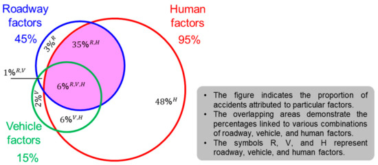 Distribution of how human, vehicle, and roadway factors result in accidents (adapted from Plankermann, K., 2014 [1]).