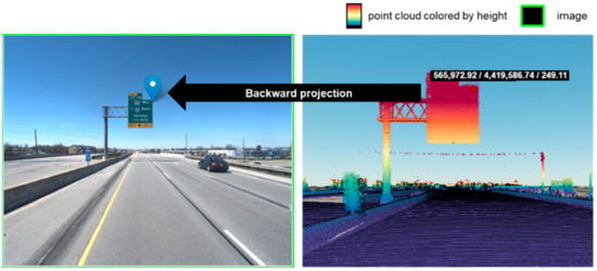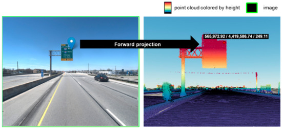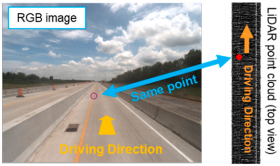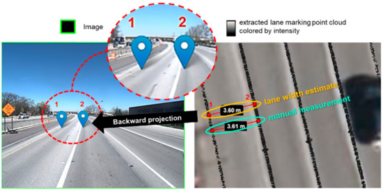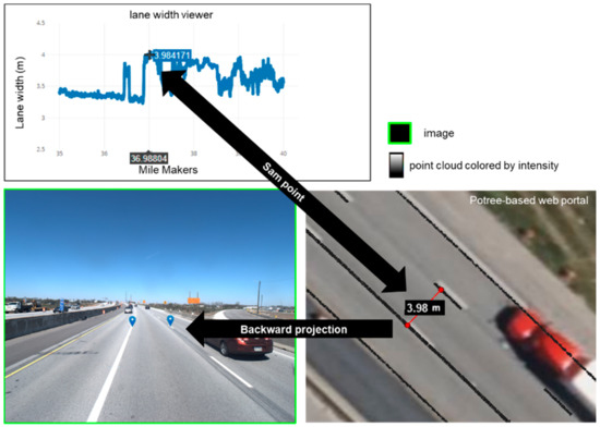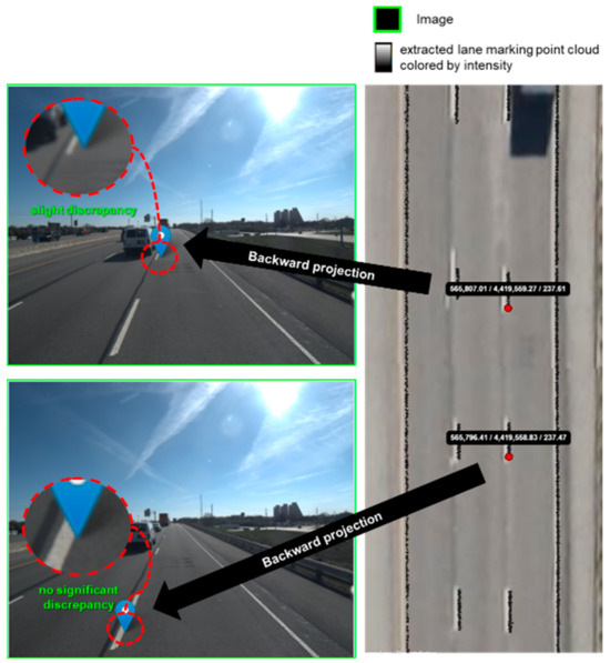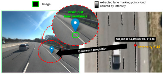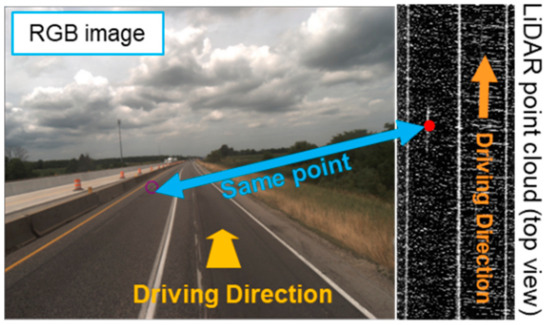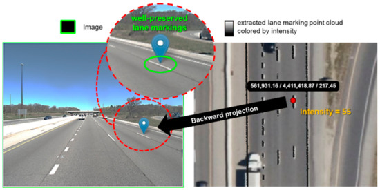 For a reporting mechanism of lane marking inventory, several transportation agencies have utilized a geographic information system (GIS) [24,25]. These GIS-based reporting mechanisms involve overlaying various 2D bird-eye-view features on top of each other for visualization or spatial analysis [26]. However, with the advent of MMS platforms, existing GIS-based reporting mechanisms may not be adequate for displaying lane marking results derived from imagery/LiDAR data. Given that an MMS captures perspective-view images, the image-based lane marking results may require orthorectification before using them in GIS-based reporting mechanisms. However, the visualization of perspective-view images in a reporting mechanism raises another issue of integrating 2D imagery and 3D LiDAR data. This issue could be addressed through forward and backward projection. Forward projection allows the transformation from a 2D point on an image to the corresponding 3D point in LiDAR data. In contrast, backward projection enables the transformation from a 3D point in LiDAR data to the corresponding 2D point on an image. Additionally, forward/backward projection in a reporting mechanism is essential for effective quality control of the results obtained from lane marking extraction, as it allows for the assessment of the alignment of derived lane markings from multiple sensors or an MMS. Nevertheless, to the best of the authors’ knowledge, no study has been found that utilizes the projection capability to develop reporting mechanisms for lane marking inventory.