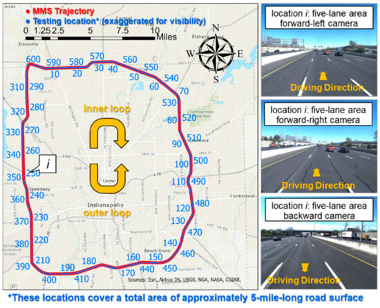 Study site, MMS trajectory (red dot), and 600 testing locations (blue dot, exaggerated for visibility) for performance evaluation along I-465, as well as sample RGB images capturing up to five lanes per driving direction in location i.