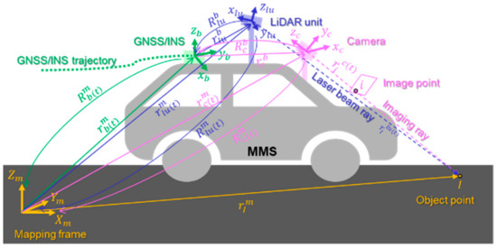 Schematic diagram of the point positioning models for GNSS/INS-assisted camera and LiDAR units onboard an MMS.