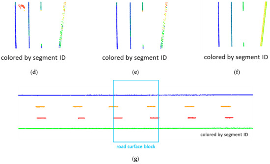 The original intensity values of these road surface blocks are then normalized using a generalized normalization approach [35], which reduces intensity variation within and across different LiDAR units (i.e., normalizing intensity across all laser beams of a LiDAR scanner as well as all LiDAR units onboard an MMS). Finally, lane markings are extracted through five steps: (i) top 95th percentile intensity thresholding, (ii) scan line-based outlier removal, (iii) density-based spatial clustering [40], (iv) geometry-based outlier removal, and (v) local and global refinement. For a given road surface block, as shown in Figure 9a, hypothesized lane markings after step (i) are illustrated in Figure 9b. Next, for step (ii), the scan lines (which represent a sequence of points emitted by a LiDAR unit, denoted by scan line in Figure 9b) within these hypothesized lane markings are removed if they exceed a certain length, as shown in Figure 9c. This removal approach is based on the assumption that scan lines within a lane marking should not exceed a pre-defined threshold (), as lane markings have a specific width. The remaining hypothesized lane marking points are grouped into isolated segments using a density-based spatial clustering algorithm, as displayed in Figure 9d. After that, a geometry-based strategy is applied to remove non-linear segments and outlier points within linear segments, as shown in Figure 9e. Removing non-linear segments relies on each segment’s principal component analysis (PCA), while removing outlier points within linear segments is based on a straight line that best fits each segment and random sample consensus (RANSAC). To connect isolated linear segments, two refinement strategies are employed: local refinement aims to connect small segments within each block and identify undetected lane marking points between small segments, while global refinement focuses on combining the same lane marking segments in successive blocks, as shown in Figure 9f,g.