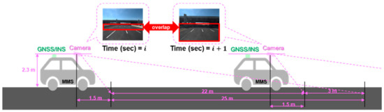 To define the 10 m boundary and 25 m boundary on an image, the LiDAR point cloud, as well as the position and orientation information of the used cameras (as described in Section 2.1), are utilized. For the 10 m boundary, the point along the road surface 10 m ahead of a camera is selected from the LiDAR data. This point is then backward projected (as described in Section 3.1) to find its corresponding point on an image, allowing for the determination of the 10 m boundary. The same procedure is implemented to determine the 25 m boundary. The boundaries, as described by their image rows, of the near/distant ROIs for each camera onboard the PWMMS-HA are listed in Table 3. One should note that the two front cameras are installed with similar downward angles, resulting in the same 10 and 25 m boundaries. However, the rear camera has a slightly steeper downward angle, leading to different 10 and 25 m boundaries. The choice of a 10 m boundary is based on a minimum design speed of 30 mph (13 m/s) and a chord length of 10 m, corresponding to an arc length of approximately 10.01 m for the minimum radius of curvature of 231 ft (70.4 m). Thus, the 10 m boundary ensures that lane markings are straight in a near ROI. In addition, the 25 m boundary guarantees sufficient overlap between successive images while the vehicle travels at speeds of approximately 50 mph (22 m/s). Given that the PWMMS-HA can capture one image per second, the gap between two successive image positions is about 22 m, which is less than the specified 25 m (resulting in around 3 m overlap between successive images), as shown in Figure 10. This study also assumes that lane markings are straight in the distant ROI, as the chord length and arc length are around 14.97 m and 15.0 m, respectively, for a minimum design speed of 30 mph.