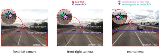 Vanishing points in near and distant ROIs for sample images captured by each camera onboard the PWMMS-HA.