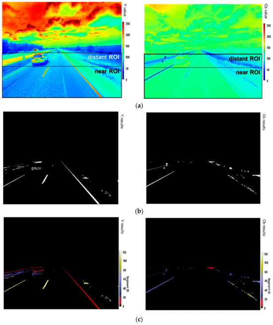 Finally, for image-based lane marking extraction, color information of lane markings (e.g., white or yellow) is utilized, as they exhibit distinct hues compared to the surrounding pavement. According to Son et al. [10], lane markings exhibit consistent characteristics in the YCbCr model under different lighting conditions. Specifically, the Y layer can be utilized to identify most lane markings, as they consistently have higher values compared to other colors, regardless of lighting conditions. Conversely, the Cb layer can be used to distinguish non-white (e.g., yellow or red) lane markings, as they consistently have lower Cb values compared to other colors under various lighting conditions. Figure 13 illustrates an RGB image captured under poor lighting conditions and the corresponding Y and Cb layers. By taking advantage of the fact that lane markings are generally brighter than the surrounding pavement, most of them can be detected in the Y layer of an image, as shown in Figure 13a. Furthermore, the Cb layer can differentiate non-white lane markings, as shown in Figure 13b. One should note that the selection of the dark RGB image in Figure 13 was deliberate to illustrate the characteristics of lane markings in the Y and Cb layers under poor lighting conditions, and these images are not a consequence of printing issues.