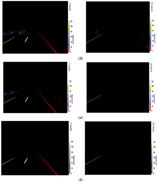 Based on the ROIs, vanishing points, and characteristics of lane markings in Y/Cb layers, image-based lane marking extraction will be implemented through the following steps: (a) RGB-to-YCbCr conversion, (b) Y/Cb thresholding, (c) connected component labeling (CCL) [45], (d) contrast-based outlier removal, (e) vanishing point-based outlier removal, and (f) 3D width-based outlier removal. Figure 14a displays the Y and Cb layers overlaid with near/distant ROIs after step (a). Step (b) applies a Y percentile thresholding ()—e.g., top 97th—to the Y layers within each ROI since lane markings have higher Y values. In addition, a Cb percentile thresholding ()—e.g., lowest third—is applied to the Cb layers within each ROI since lane markings have lower Cb values. The selection of the top ninety-seventh and lowest third thresholding is based on the experiments conducted by Son et al. [10]. The results after Y/Cb thresholding are shown as binary images in Figure 14b. Subsequently, the detected pixels in each binary image are grouped into several segments based on four connectivity-based CCL in step (c), as presented in Figure 14c. After that, step (d) identifies segments with low contrast compared to their neighboring area and eliminates them as false positives, as displayed in Figure 14d. In step (d), each lane marking segment is divided into smaller segments using a length parameter ()—e.g., 100 pixels—along the column direction of an image, as shown in Figure 15. Then, a buffer is created around each small segment by a buffer parameter ()—e.g., 20 pixels—along the row direction of an image, and the average Y/Cb value within the buffer is calculated. Additionally, the average Y/Cb value within each small segment is computed. If the difference between the Y/Cb averages of a small segment and its surrounding buffer is less than a pre-defined threshold (), the small segment is deemed a false positive and subsequently removed. Step (e), as shown in Figure 14e, eliminates segments whose directional vector is not parallel to the vector formed by connecting its centroid to the corresponding vanishing point (the correspondence is determined based on near and distant ROIs). Step (f) involves checking the average 3D distance between the two edges across the main direction of each segment to remove outliers. The two edges are forward projected onto LiDAR data (as explained in Section 3.1), and the average distance between the projected edges is computed. Segments whose width does not meet the standard size of lane markings () are removed. The lane marking segments after step (f) are illustrated in Figure 14f. Finally, the results from the Cb layers can be used to differentiate between white and non-white lane markings extracted from the Y layers.