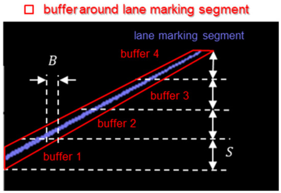 Schematic diagram of a lane marking segment in an image and the corresponding buffer determined by a length parameter (S) and a buffer parameter (B).