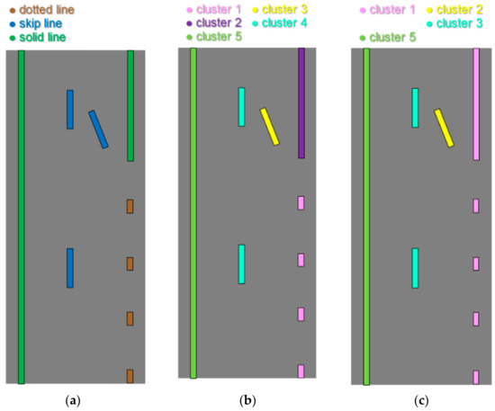 Lane marking classification algorithm: (a) length-based classification, (b) spline-based clustering, and (c) reference-based clustering.