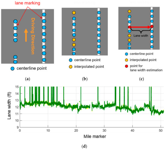 After the classification, the resultant lane marking clusters can be utilized to derive intensity and lane width information. For intensity profile generation, each lane marking cluster (as shown in Figure 18a) is divided into 20 cm portions along the driving direction. The average intensity values are computed for each portion, and a graph can be created to display the average intensity against the traveled distance, as shown in Figure 18b. Lane width estimation starts with lane marking clusters. First, centerline points are generated at intervals of 20 cm along each cluster, as displayed in Figure 19a. In cases with missing lane markings for the gaps between dashed or dotted lines, a linear interpolation is performed to fill the gap between two consecutive centerline clusters, as shown in Figure 19b. One should note that this study adopts linear interpolation as per the FHWA standard [5], which stipulates that a straight line should connect two dashed/dotted lane markings. However, to avoid linear interpolation on curved roads, interpolation is not applied if the gap exceeds a pre-defined threshold (. Subsequently, lane width can be computed using opposite centerline points from different lane marking clusters, as presented in Figure 19c. Finally, a plot can be generated to display the lane width against the traveled distance, as shown in Figure 19d.