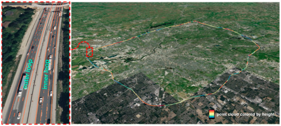 To demonstrate the capability of the proposed image-aided LiDAR framework, the PWMMS-HA is employed to collect a large set of imagery and LiDAR data. Specifically, a 110-mile section of I-465 in the United States, which includes both inner and outer loops, is surveyed. The trajectory and testing locations, where the performance of the proposed approaches (discussed later in Section 4.3) was evaluated, along I-465 are depicted in Figure 5. For the testing locations in Figure 5, locations 1–300 are situated on the inner loop, while locations 301–600 are located within the outer loop. The PWMMS-HA was able to capture up to five lanes per driving direction, denoted by location i in Figure 5. The specifications of the acquired imagery and LiDAR datasets along I-465 are provided in Table 2. The average local point spacing (LPS) of the road surface point clouds captured by the PWMMS-HA is 2.5 cm.