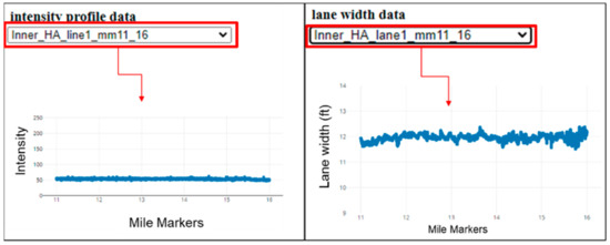 The performance of the proposed framework was evaluated using a dataset of 22,428 images and approximately 42,000 million LiDAR points collected along I-465 in the United States. Lane markings spanning around 110 miles (55-mile-long inner and outer loops) were extracted using the image-aided LiDAR approach, requiring an average of 100 min per mile for processing. The proposed framework improves the performance of lane marking extraction, as evidenced by the highest F1-score (92.5%) of the image-aided LiDAR approach, outperforming the LiDAR-based (90.3%) and image-based (77.8%) ones. Specifically, the recall increase of 0.4%—from 87.6% (LiDAR based) to 91.6% (image-aided LiDAR)—surpasses the slight improvement in the precision of 0.2%—from 93.2% (LiDAR based) to 93.4% (image-aided LiDAR). These findings indicate that the enhancement in LiDAR-based extraction is more pronounced when addressing omission errors rather than compensating for commission errors. On the other hand, the web portal can render the LiDAR datasets along I-465 in around ten seconds and visualize intensity profiles and lane width estimates. Additionally, users can select points of interest in an intensity profile/lane width plot, which will then be highlighted as points in the corresponding LiDAR data. Furthermore, the highlighted points can be projected onto the corresponding images where they are visible.