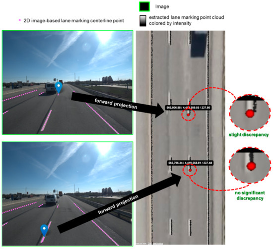 Based on the lane markings derived from the LiDAR-based and image-based strategies described in Section 3.2.1 and Section 3.2.2, respectively, image-aided LiDAR lane marking extraction can be conducted. First, all lane marking segments extracted from images are forward projected (as explained in Section 3.1) onto LiDAR data. In this study, the results obtained from all the images captured by the three cameras are projected onto LiDAR data. Figure 16 illustrates examples of the centerline points (at intervals of 10 pixels) of 2D image-based lane markings and the corresponding forward projected points onto the LiDAR data. Thereafter, considering the complementary characteristics of camera and LiDAR units (as mentioned in Section 1), LiDAR-based lane markings can be refined based on the correspondence between image-based and LiDAR-based lane markings. In this study, the correspondence between image-based and LiDAR-based lane markings is determined by a distance threshold ()—e.g., 20 cm—as follows: