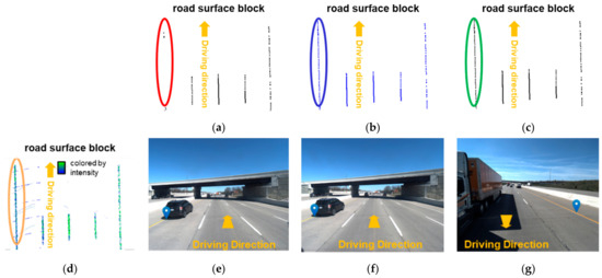 LiDAR-based lane marking extraction workflow: (a) road surface block, (b) hypothesized lane markings, (c) lane marking points after the scan line-based outlier removal, (d) lane marking segments after density-based spatial clustering, (e) lane marking segments after geometry-based outlier removal, lane marking segments after (f) local and (g) global refinements.