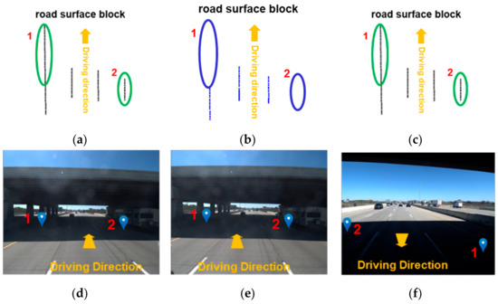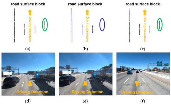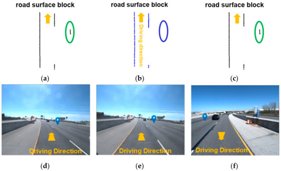 Illustrations of centerline points derived through (a) LiDAR-based, (b) image-based, and (c) image-aided LiDAR lane marking extraction in areas where lane markings were not detected using the image-based approach (blue oval)—due to insufficient resolution for representing a dotted lane marking in imagery (blue placemark)—but were successfully identified using the LiDAR-based and image-aided LiDAR strategies (green oval), as well as the corresponding images captured by (d) front-left, (e) front-right, and (f) rear cameras onboard the PWMMS-HA.