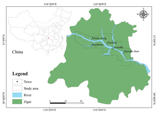 This work takes the Zigui section of the Three Gorges Reservoir area as an example. The study area is located in the mountainous area of Western Hubei Province, in the transition zone from the second to the third step of China’s topography. The geographic location of the study area is shown in Figure 3. It is the confluence of the Eastern Sichuan fold and the Western Hubei mountainous area, and is characterized by a medium and low mountain erosion canyon landform [29]. The strata in the study area were relatively well developed, and the Aurignacian to Quaternary strata were exposed. The strata in this area are diverse in lithology and complex in structure, providing conditions for the development of geological disasters, and some strata (such as the Badong Formation and Jurassic strata) are known as slip-prone strata [30,31]. In the study area east of the Xiangxi River, strata older than the Triassic, predominantly carbonate rocks are continuously exposed. West of the Xiangxi River, the exposed strata are primarily from the Middle Triassic to Jurassic (T_2-J), consisting predominantly of clastic rocks including sandstone, siltstone, and shale. In the study area, the Xintan landslide took place in 1985, the Qianjiangping landslide in 2003 [32,33], as well as the Yangjiawan landslide and the Shanshucao landslide that occurred during heavy rainfall in 2014, and the Yanguan landslide and the Bobao landslide that occurred during prolonged rainfall in 2017.