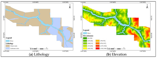 Lithology is one of the controlling factors for the thicknesses of accumulation. Carbonate rocks are exposed in the study area east of the Xiangxi River, exhibiting high rock strength and resistance to weathering, with a thin accumulation cover and even bedrock outcrops. West of the Xiangxi River, clastic rocks dominate, comprising sandstone, siltstone, and shale lithologies. With low rock strength and weak resistance to weathering, the rocks form a relatively thick accumulation cover. Therefore, this study considers the engineering geological rock group as the evaluation factor and divides the study area into clastic rocks and carbonate rocks.