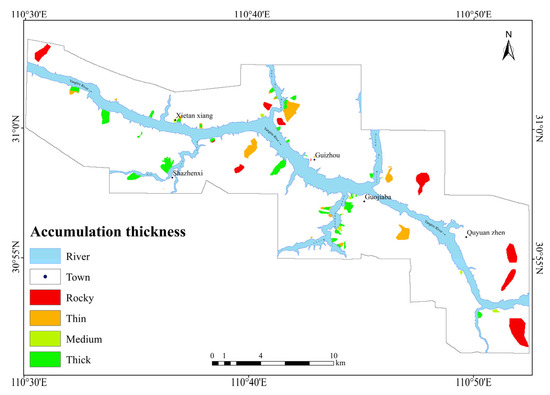 - Medium and thick accumulation areas: Xintan section of the main stream of the Yangtze River, the south bank of the Shuping–Fanjiaping section and the Dongmentou–Chuwangjing section, as well as the right bank of the major tributary Xiangxi, and the banks of the Qinggan, Tongzhuang, and Guizhou Rivers.