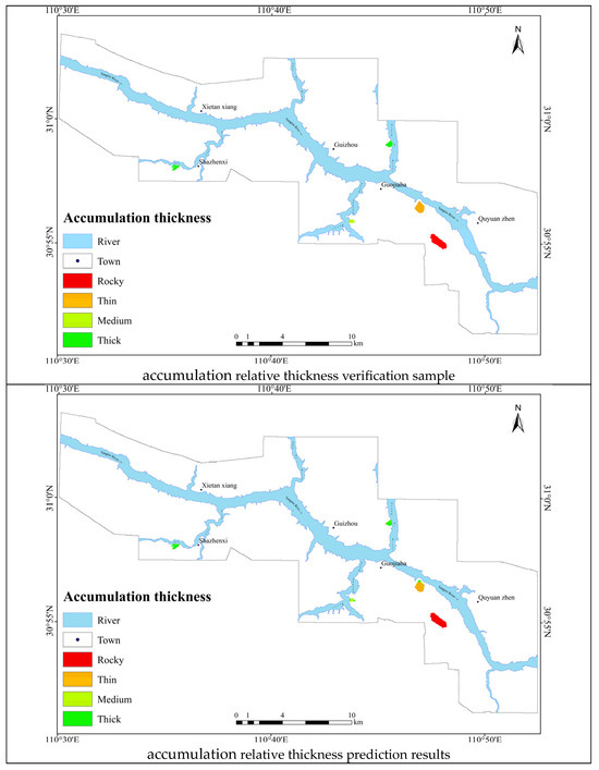 The estimation results for the relative thickness of accumulation in the study area were generated and presented in Table 3. Additionally, the spatial distribution map of the relative thickness of accumulation in the study area was created using ArcGIS software (Figure 6).