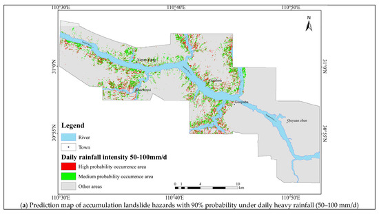 - The accumulation landslide hazards area with a 90% probability, induced by daily heavy rainfall intensity (100–250 mm/d), is located in areas with clastic rock lithology. The area of high susceptibility to landslide hazards lies to the west of the Xiangxi River, with smaller areas to the east, having slopes between 20° and 35°. The middle probability occurrence area lies to the west of the Xiangxi River, with a slope of more than 35°.