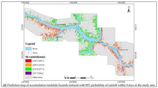 Prediction map of accumulation landslide hazards induced with 90% probability of rainfall within 1, 5, and 9 days.