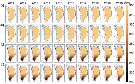 In this study, the surface melt results of the GrIS were calculated for the period from 2011 to 2020. The passive microwave data used included DMSP and SMOS morning and evening data. The DMSP satellite data provide the effective number of days, with a value of 365 or 366 days, and the latter has the same parameter but with an average value of 301 days. Figure 1 provides the effective days in Greenland with data for both satellites for the period of 2011 to 2020. It can be seen that the effective days with DMSP satellite data in all regions of Greenland were close to a full year. However, the SMOS satellite data accounted for different effective days in different regions of Greenland (the number of effective days in the north was higher than in the south). This is because the SMOS satellite calculation of the melt status depends on the number of available incidence angles. For a pixel of the SMOS satellite, there are 14 angles of incidence, but not all of them provide brightness temperature. The melt status of a pixel can be calculated when the number of incidence angles providing brightness temperature is greater than 5.