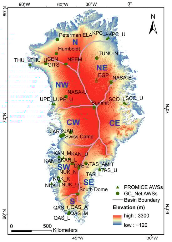 The distribution of the AWSs on the GrIS. The green dots represent the sites; the gray line represents the boundary line of the watershed; and the background color shows the elevation, with blue for low values and red for high values. The GrIS is divided into eight basins: northern (N), northwestern (NW), northeastern (NE), west-central (CW), east-central (CE), southwestern (SW), southeastern (SE), and southern (S).