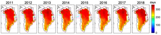 The assessment data used in this study included site air temperature data and MODIS ice surface temperature data. The former data were obtained from both the GC_Net and PROMICE datasets. Table 1 and Table 2 provide the number of valid days from 2011 to 2020 for the stations in both datasets. For a specific site, we may not necessarily have data for every year between 2011 and 2020, and for a specific year, a site may not necessarily provide temperature data for 365 or 366 days. Figure 3 provides the number of valid days with MODIS ice surface temperature data from 2011 to 2018, the average of which was 294 days. The number of valid days with MODIS ice surface temperature data was unevenly distributed across the various regions of Greenland (the number of valid days is higher in the north than in the south) (Figure 3). This is due to the fact that MODIS data are susceptible to cloud cover, which makes them unavailable in some areas.