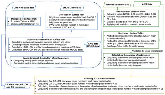 The uncertainty that SGLs introduce into the passive microwave inversion of surface melting data has been discussed in previous studies. For example, Houtz et al. stated that L-band data may underestimate the liquid water volume when SGLs are present [11], and Li et al. asserted that the Ka band may cause false-positive retrieval when SGLs are present [21]. However, the uncertainty introduced by SGLs into the inversion of surface melting data in different passive microwave bands has not been confirmed. The accurate monitoring of surface melting necessitates a comprehensive evaluation of this uncertainty. To investigate the impact of SGLs on surface melting data inversion in various passive microwave wavebands, in this study, we primarily conducted the following tasks: DMSP Ka-band and SMOS L-band data were employed to estimate the surface melting of the GrIS from 2011 to 2020, and the spatio-temporal distribution of surface melt and surface melt errors was analyzed (refer to Section 3.1). Subsequently, Sentinel-2 summer data from 2016 to 2020 were utilized to identify SGLs in the vicinity of Automatic Weather Stations (AWSs) (refer to Section 3.2) and examine their influence on Ka-band and L-band data (refer to Section 3.3).