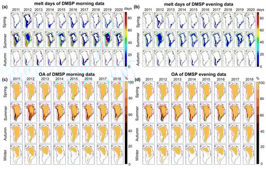 Melt days and overall accuracy of DMSP data. (a,b) represent the melt days of DMSP morning and evening data, respectively, in spring, summer, and autumn (2011–2020); (c,d) denote the OA values of DMSP morning and evening data, respectively, in spring, summer, autumn, and winter. The blank areas indicate NaN values.