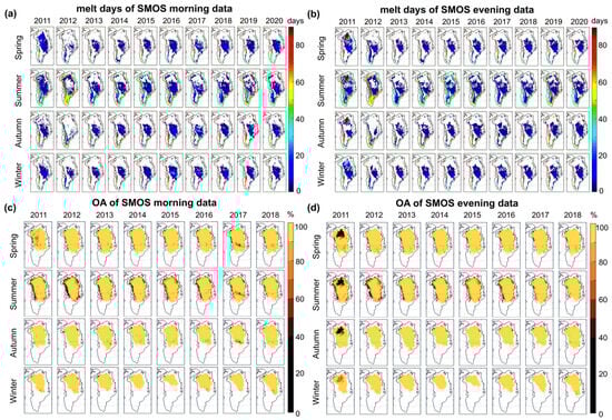 Melt days and overall accuracy of SMOS data. (a,b) represent the number of melt days according to SMOS morning and evening data, respectively, in spring, summer, autumn, and winter (2011 to 2020); (c,d) indicate the OA values according to SMOS morning and evening data, respectively, in spring, summer, autumn, and winter, with the blank areas denoting NaN values.
