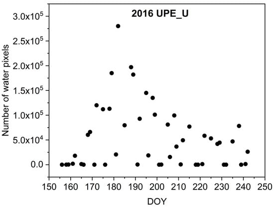 Number of water body pixels per day during the summer of 2016 in a grid where UPE_U was located. The horizontal coordinate represents the day of the year, and the vertical coordinate represents the number of water body pixels.