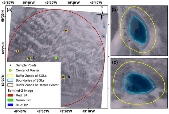 Sample point selection. (a) A synthetic image relative to the 2016 Sentinel-2 summer season within the grid where Swiss Camp was situated; the green point represents the center of the grid, the red point signifies the selected sample point, the red boundary denotes the 14 km buffer zone in the center of the grid, the blue boundary represents the artificially mapped boundary of the SGLs, and the yellow boundary indicates the 200 m buffer zone. (b,c) depict magnified views of the two SGLs in Figure (a), respectively.