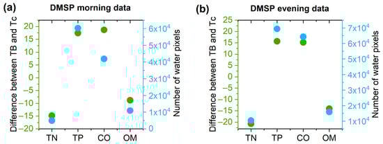 Number of SGL water body pixels (right y-axis) with the difference between brightness temperature and melting threshold data (left y-axis) based on surface melt indicated by DMSP data, categorized into true negatives, true positives, commission error, and omission error. (a) DMSP morning data; (b) DMSP evening data.