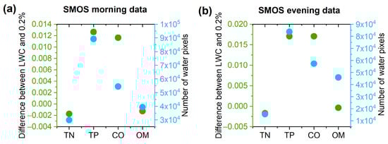 The number of SGL water bodies (right y-axis) and the difference between the actual LWC and the model 0.2% LWC (left y-axis) for surface melt are indicated by the SMOS data as truly negative, truly positive, misclassified, and overlooked. (a) SMOS morning data; (b) SMOS evening data.