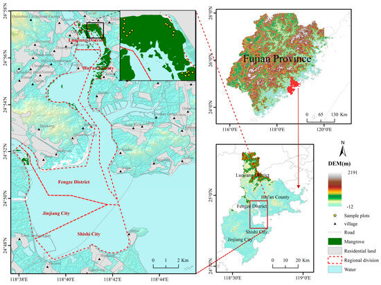 As shown in Figure 1, our study area was the Quanzhou Bay Estuary Wetland (QBEW), Fujian, on the southeastern coast of China. It has a southern subtropical maritime monsoon climate, and its administrative division includes five counties: Hui’an County, Luogang District, Fengze District, Jinjiang City, and Shishi City, with a total area of 7065.31 ha [37]. The QBEW is a subtropical estuarine mudflat wetland with China’s largest continuous area of artificially planted mangrove forests. It has been listed as one of “Asia’s Important Wetlands”, one of “China’s Priority Ecosystems”, one of “China’s Important Wetlands”, and one of “Fujian’s Important Wetlands” [38]. The QBEW and its surrounding villages are densely populated, and land use–wetland conservation conflicts in the area are prominent. The main protection objects of the QBEW area are the wetland ecosystem, the mangroves, and the various rare wild animals that inhabit the area. Artificial mangrove planting began in 2000. The artificial planting communities are mainly distributed on the east bank of the Louyang River, including a single community of Aegiceras corniculatum, a community of Kandelia obovata, and a mixed community of Kandelia obovata and Aegiceras corniculatum [39]. Based on comprehensive considerations of safety and wetland accessibility, we conducted a field survey of the mangroves near Luoyang Bridge.