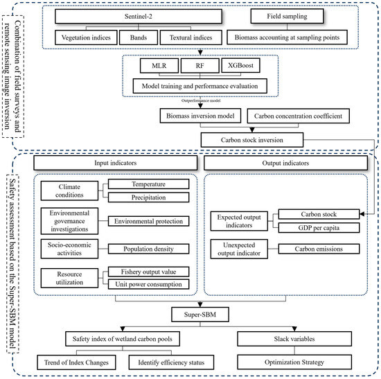 We propose a novel framework to scientifically quantify the safety of wetland carbon stocks (Figure 2). The framework mainly consists of two parts. The first part is the carbon stock estimated based on field surveys and DL-based remote sensing data inversion. The second part is a safety assessment based on the Super-SBM model. This framework can incorporate the input–output indicators that affect the safety of wetland carbon stocks and produce an efficiency value and slack variables that support the creation of optimized strategies.