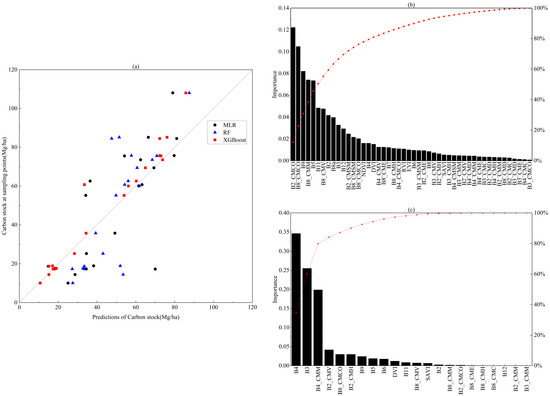 As shown in Figure 3, the two ML-based models had more accurate carbon stock prediction results than the traditional MLR model. Compared with the RF model, the cumulative feature importance of the XGBoost reached the 90% threshold faster, with a smaller number of features. The B4 (blue) and B3 (green) bands are the top two features of the XGBoost model, contributing about 60% of the importance. The texture features B4_CMM, B2_CMV, B8_CMCO, and B2_CMH are highly important, ranking from 3 to 6. The importance rankings of the DVI and SAVI are 10 and 13, respectively.