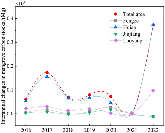 Figure 4 shows the time series of the mangrove carbon stocks in the QBWE. The overall trend is highly consistent with that of Hui’an, and both trends have two peaks and two valleys. Carbon stocks surged in 2022, with an increment of about 3729 Mg, which was twice the first peak (2017). The incremental fluctuations in total carbon stocks are consistent with those in Hui’an County, indicating that Hui’an is the major contributor. However, there has been almost no increase in carbon storage in Jinjiang and Fengze districts. There has been a significant increase in Luoyang District in 2022, where carbon storage changes have been small for a long time.