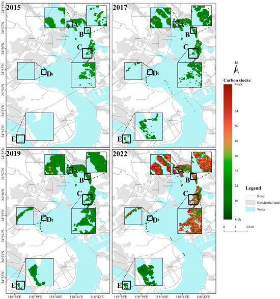 Since 2015, the total mangrove area has increased from 147 ha to 285 ha, an increase of about 93.88%. Figure 5 shows the spatial distribution of the mangrove carbon stocks. The areas with the most significant changes in carbon stocks are Luoyang Bridge (A), Yutou Bay (B), the west of Zeng’an Village (C), Fengze Xunmei (D), and the Jinjiang River Estuary (E). The mangrove area around Luoyang Bridge (A), located at the mouth of the Luoyang River, increased first, and it has had the largest carbon stock increase. Natural mangrove forests first grew in Fengze Xunmei (D) and the region between Luoyang Bridge (A) and the west of Zeng’an Village (C). By 2022, the mangrove unit carbon stocks ranged from 5.85 to 85.71 Mg/ha.