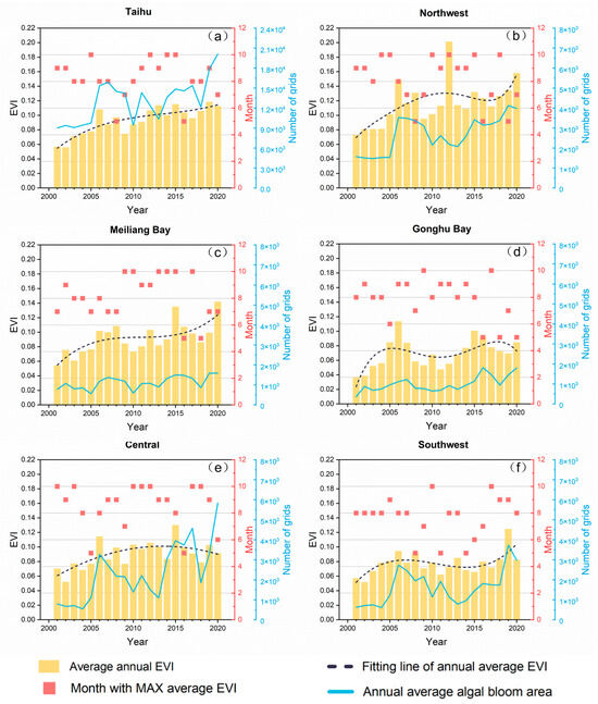Temporal evolution of annual mean EVI (yellow bars) along with its fitting curve (black dashed lines), the annual averaged no. of grids that are covered by cyanobacterial blooms (light blue solid lines), and month of maximum EVI (red squares) in Taihu Lake (a) and its subregions (b–f), representing the Northwest, Meiliang Bay, the Gonghu Bay, the Central, and the Southwest, respectively.