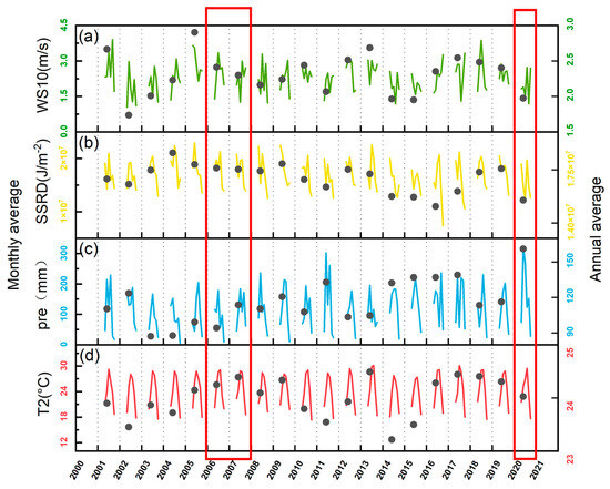 Time series of monthly (lines) and annual (black solid dots) mean WS10 (a), SSRD (b), T2 (d), and monthly and annual accumulated precipitation (c) in the Taihu Lake region from 2001 to 2020.