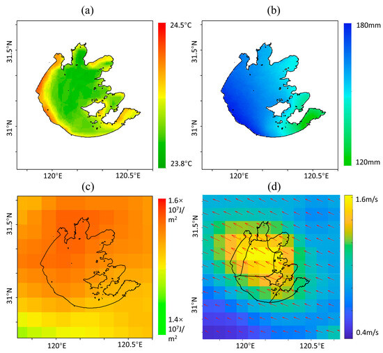 Annual average T2 (a), pre (b), SSRD (c), and wind field (d) diagram of Taihu Lake in 2020.