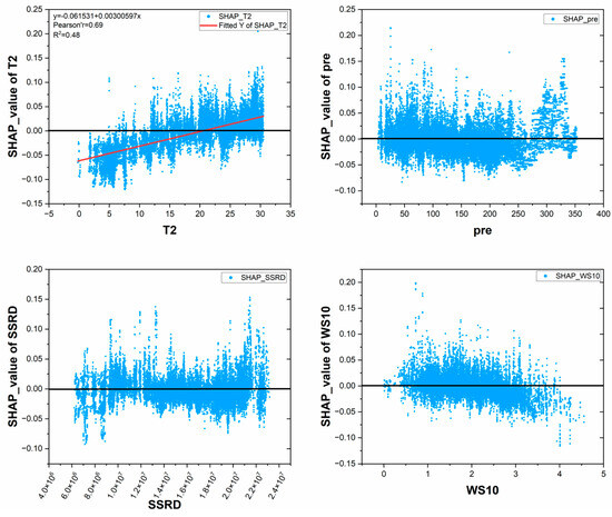 The relative relationship between various meteorological factors and SHAP values for the entire Taihu Lake.