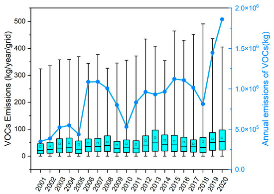 In accordance with the data introduced earlier, the emission rate of VOCs in Taihu Lake was determined. Our calculations exclusively consider the months from May to October. Figure 8 illustrates the estimated annual maximum aggregate emissions of VOCs associated with cyanobacterial blooms in Taihu Lake, as well as the range of emissions of each grid (illustrated as a boxplot), during the period 2001–2020.