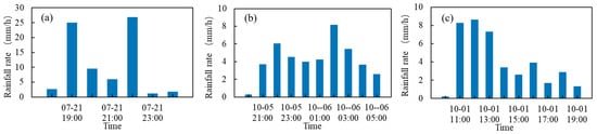 Three rainfall processes in 2021 and 2022. (a) 20210721 rainfall event; (b) 20211005 rainfall event; (c) 20221001 rainfall event.