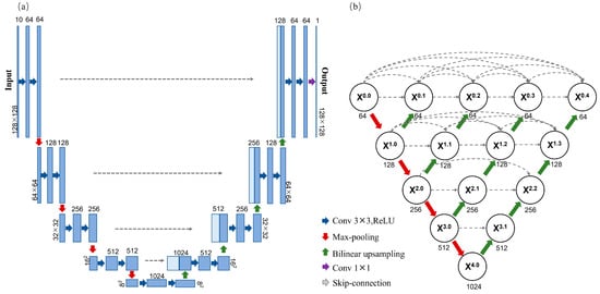 Structure of U-Net and U-Net++. (a) The structure of U-Net. (b) The structure of U-Net++.