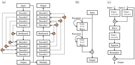 The Double Recurrent Residual and Attention gates U-Net (DR2A-UNet) is obtained based on the Double U-Net structure improvement, as shown in Figure 4a. Double U-Net [28] network consists of two U-Net networks stacked and combined with each other. The network has two encoder–decoder structures, which improves the image feature extraction ability and feature reduction ability. On this basis, the original convolution block in the network is replaced with residual unit and recurrent convolution (Recurrent Residual; R2) [29], the structure is shown in Figure 4b. The convolution layer of R2 consists of 3 × 3 convolution kernel, Batch Normalization (BN), and Rectified Linear Unit (ReLu). The recurrent residual operations do not increase the number of network parameters; the addition of residual unit can avoid the overfitting phenomenon caused by the network layers being too deep, and, at the same time, avoid the phenomenon of gradient explosion and gradient disappearance. The recurrent convolution makes the model able to better extract the low-level features, which improves the accuracy of the model. In addition, the embedding of the attention gate (shown in Figure 4c) enables it to enhance the extraction of image features while suppressing irrelevant regions, thus ensuring that the network focuses on with the echo image features and improves the accuracy of the decoding results. In the attention gate, input 1 is the feature map before each layer of convolutional skip connection in the coding structure, and input 2 is the feature map before each upsampling in the corresponding decoding structure. Point-by-point addition operation is carried out after the convolution and the attention coefficients are obtained in order to highlight locally important features.